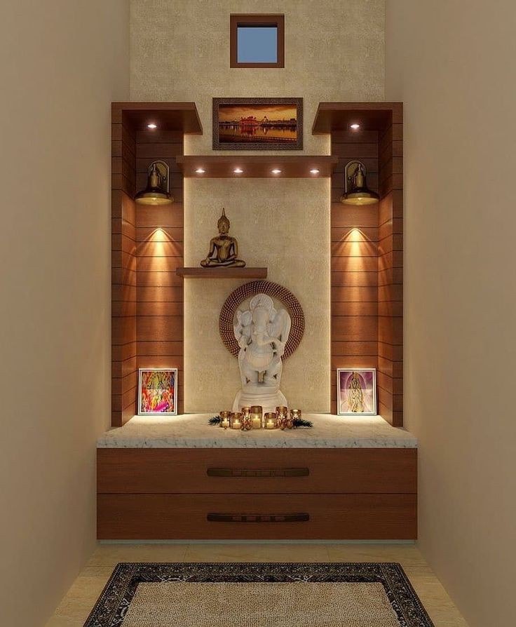 - Altar: The altar is the focal point of the pooja room. Choose a small table or platform to place the deity or deities. You can also place a photograph or statue of your favorite deity. Decorate the altar with flowers and candles.